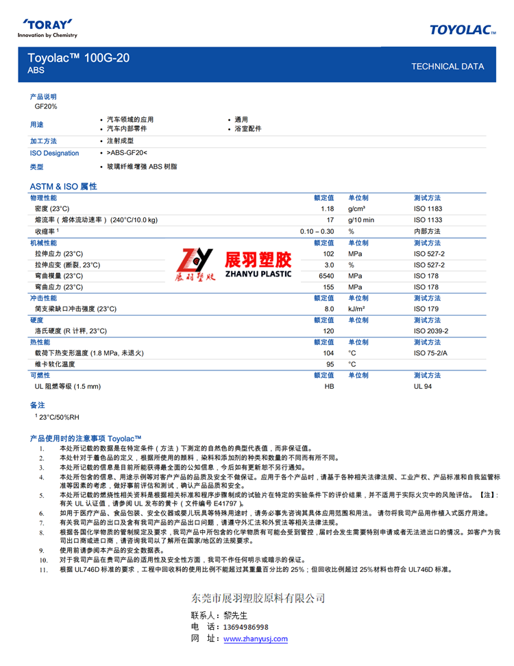 東麗 Toyolac™ ABS 100G-20 >ABS-GF20< 阻燃等級(jí): HB 熔融指數(shù): 17 g/10min 缺口沖擊: 8.0 kJ/m2 符合規(guī)定: UL ? UL 94