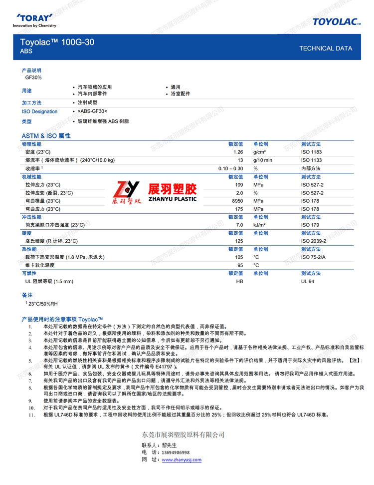 ABS 東麗 Toyolac 100G-30 玻纖增強(qiáng)30% 汽車內(nèi)部零件 電子電器 浴室配件