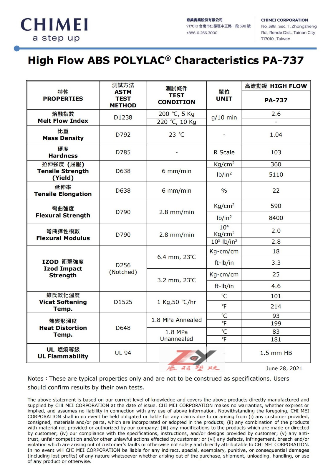 臺灣奇美 PA-737 高流動性 ABS樹脂 大面積或薄壁模塑產(chǎn)品