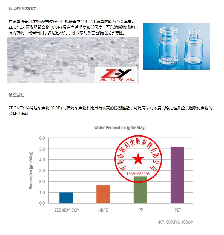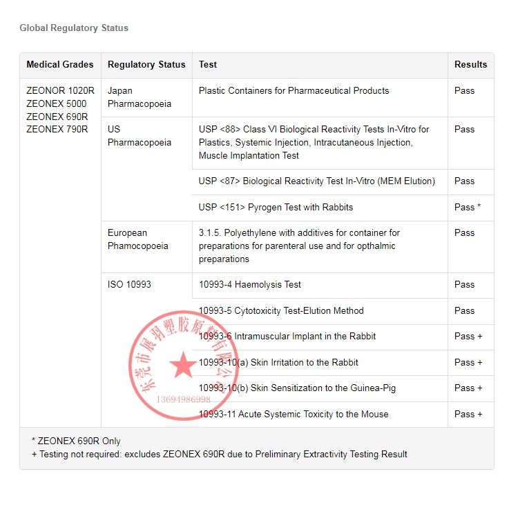 COC日本瑞翁生產(chǎn)的 ZEONEX? 5000 是一種不溶于水、無味、無色的環(huán)烯烴聚合物 (COP) 牌號。它具有玻璃般的透明度、低蛋白質(zhì)吸收和精密成型性。它具有高透明度、低霧度、低吸水性、耐破裂性和耐化學性。該等級提供高純度/低排氣和出色的防潮性。它顯示出與伽馬、過氧化物和環(huán)氧乙烷氣體 (EOG) 的滅菌兼容性。ZEONEX? 5000 通過注射吹塑和薄膜擠出加工而成。它用于預充式注射器、西林瓶、瓶子和其他用于預充式藥物儲存的藥物輸送裝置。其他應用包括腸胃外和凍干生物制藥、高粘度藥物、透明質(zhì)酸以及造影劑的包裝。符合日本藥典、美國藥典(USP 88 Class VI、USP 87)和歐洲藥典。符合ISO 10993標準的要求。