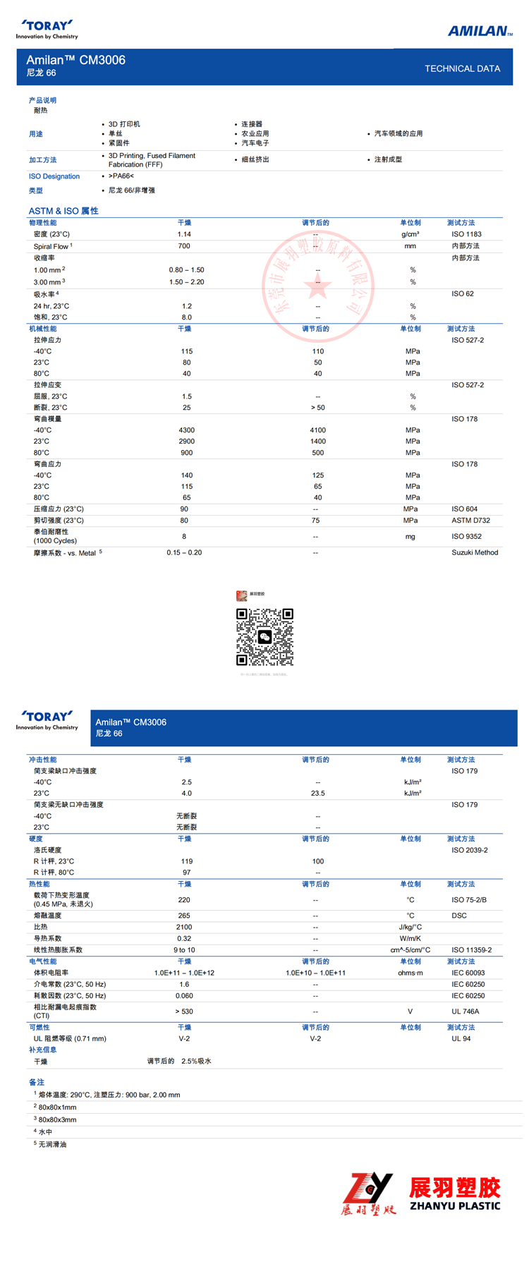 AMILAN® CM3006 是一種熱穩(wěn)定聚酰胺66 (PA 66) 等級。具有高流動性、優(yōu)異的強度、韌性及抗摩擦磨損性能。具備