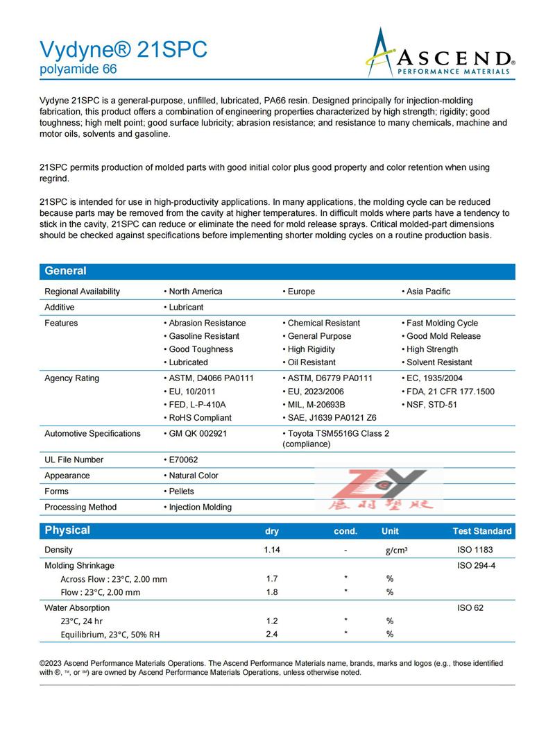 奧升德 Vydyne? PA66 21SPC >PA66< 阻燃等級(jí): V-2 ,缺口沖擊: 6.0 kJ/m2 ,熱變形溫度: 200 °C ,
