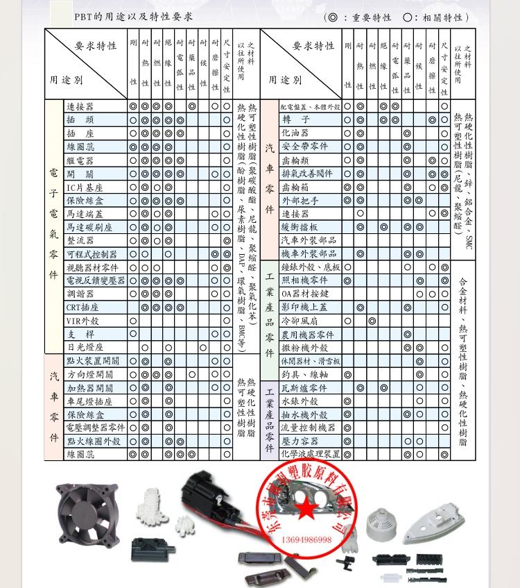 保由1,4 丁二醇(1,4-Butylene glycol)與對苯二甲酸(PTA)或?qū)Ρ蕉姿狨?DMT)聚縮合而成,並經(jīng)由混練程序製成之熱塑性聚酯樹脂,其具有多項優(yōu)良之特性,被廣泛應(yīng)用於電子、電氣、資訊、通訊及汽車工業(yè),為泛用工程塑膠中最受注目之材料,