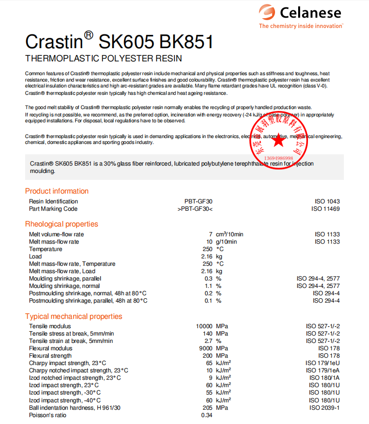 Crastin SK605 BK851是一種30%玻璃纖維增強,潤滑聚對苯二甲酸丁酯用于注射成型樹脂。