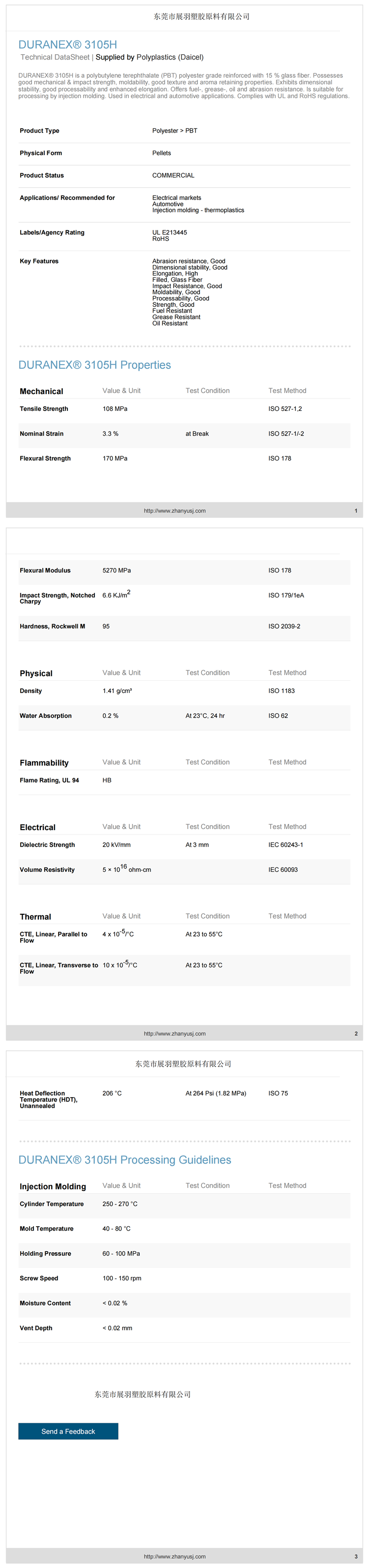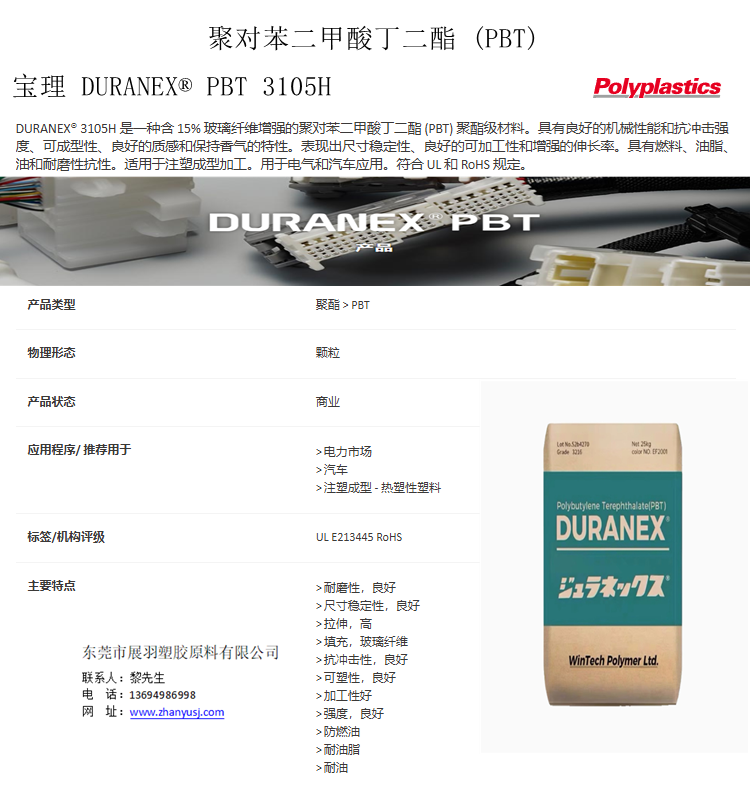 寶理 DURANEX® PBT 3105H 玻璃纖維15% 高流動(dòng)性 高韌性 防燃油 電氣和汽車應(yīng)用 東莞市展羽塑膠原料有限公司