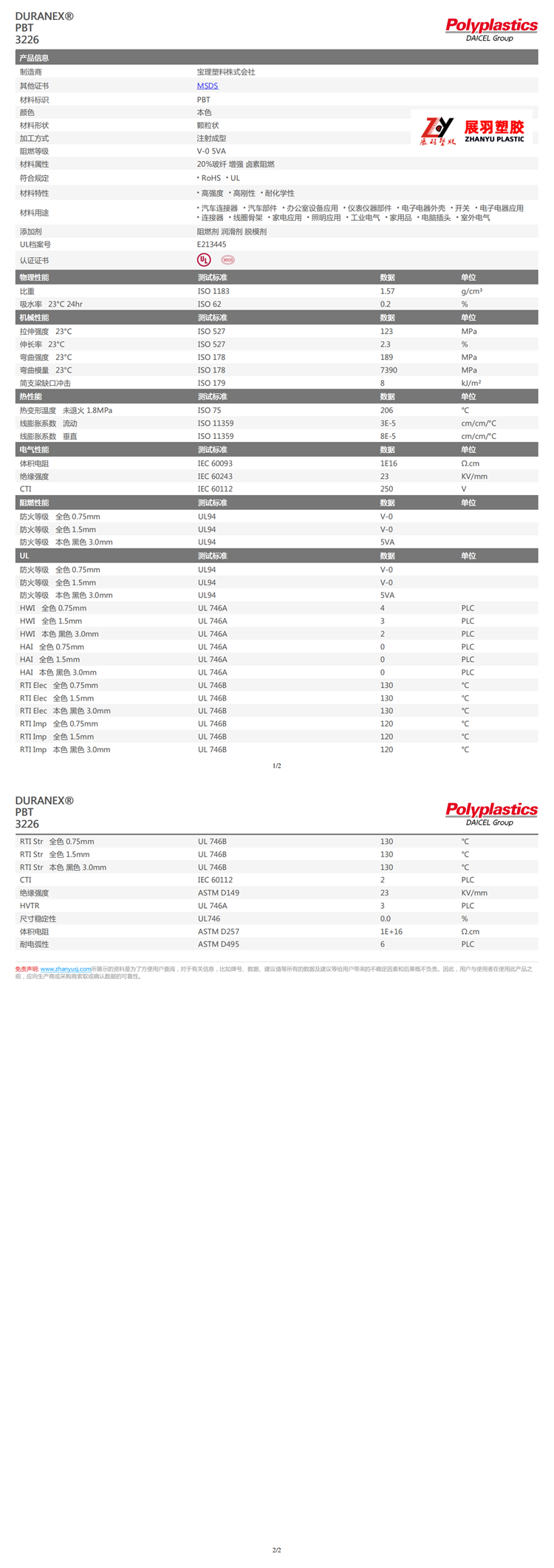 DURANEX PBT 3226 日本寶理 >PBT-GF20-FR(17)< 阻燃等級(jí): V-0 ? 5VA 缺口沖擊: 8 kJ/m2 符合規(guī)定: RoHS ? UL