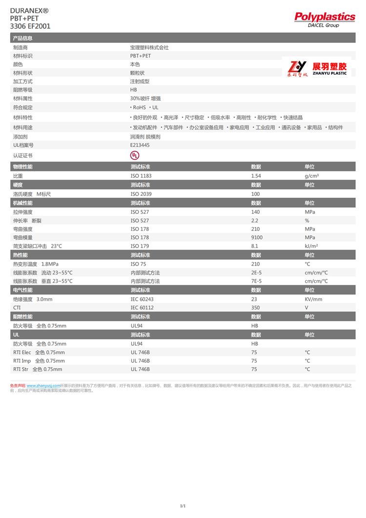 阻燃等級(jí): HB 比重: 1.54 g/cm3 缺口沖擊: 8.1 kJ/m2 符合規(guī)定: RoHS ? UL
