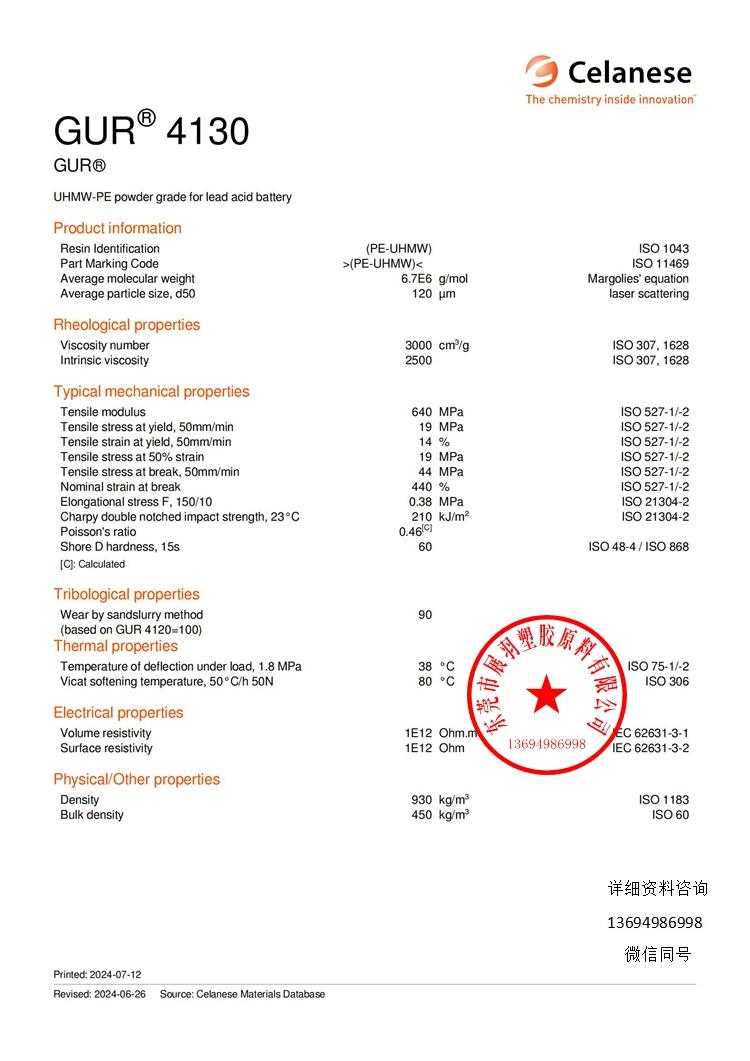 塞拉尼斯 GUR 4130 超高分子量聚乙烯 UHMW-PE粉末級 鉛酸電池專用