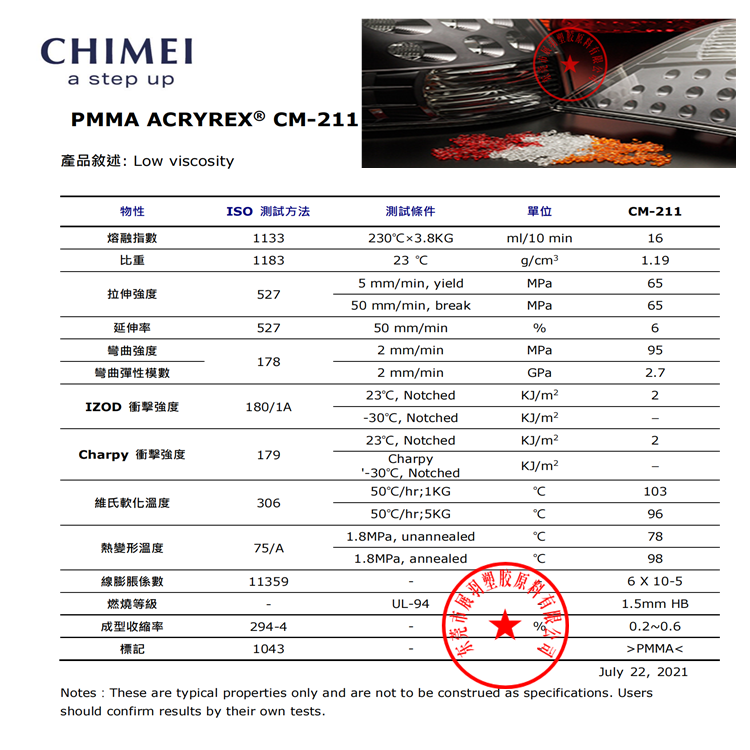 臺灣奇美 ACRYREX® CM-211 是一種低粘度聚甲基丙烯酸甲酯 (PMMA) 牌號。具有高流動性和易于模具加工。具有潔凈度好、透明度和光澤度高、物理、化學(xué)、光學(xué)、電學(xué)性能穩(wěn)定等特點。專為注射成型方法而設(shè)計。 ACRYREX® CM-211推薦用于電子板、一般音響面板、日常家用電器以及異形和難注塑模具加工裝飾品。符合 PFOA、PFOS、RoHS 和 UL 94 HB 阻燃等級。