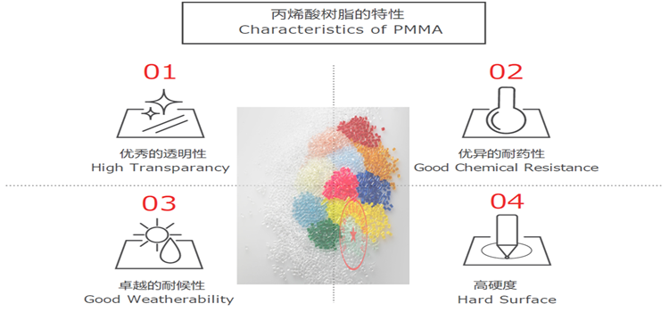 PMMA 樹脂主要由甲基丙烯酸酯 (MMA) 組成,具備清晰的透明度及高光澤等特性,以其出眾外觀贏得「塑料皇后」的稱號(hào),還提供穩(wěn)定的物理、化學(xué)、光學(xué)及電氣性質(zhì)。三菱化學(xué)是全球最大的 PMMA 樹脂供貨商,除了能以樹脂形式供貨,也供應(yīng)適合導(dǎo)光板的片材。這種材料廣泛用于電子面板、機(jī)械零件、鐘表表面、車燈、電信設(shè)備、絕緣零件、太陽(yáng)眼鏡、食品和水接觸材料、化妝品容器及玩具,符合 RoHS、REACH SVHC、UL 及多種國(guó)際標(biāo)準(zhǔn),適合各種應(yīng)用使用。