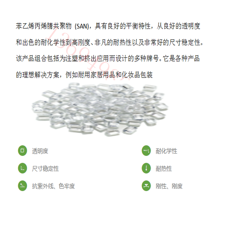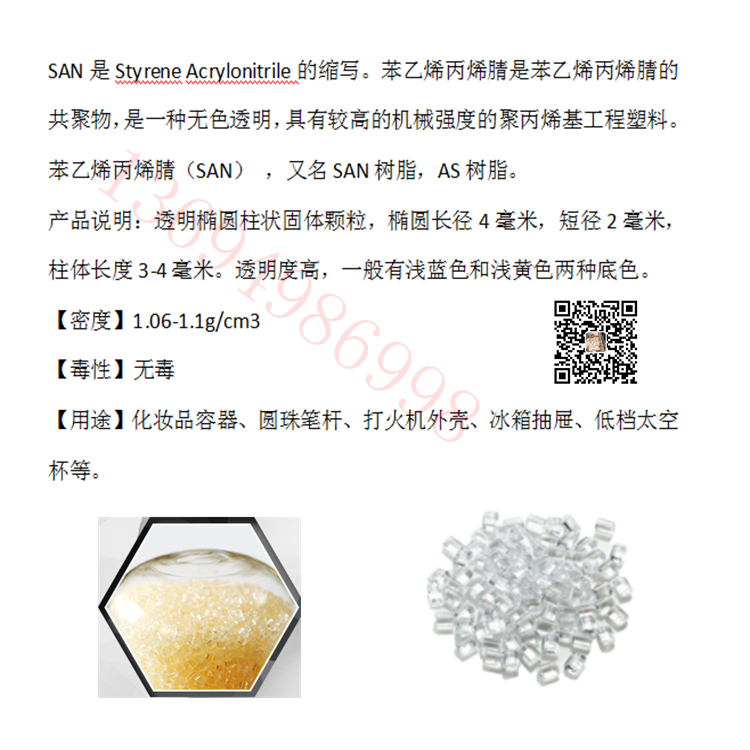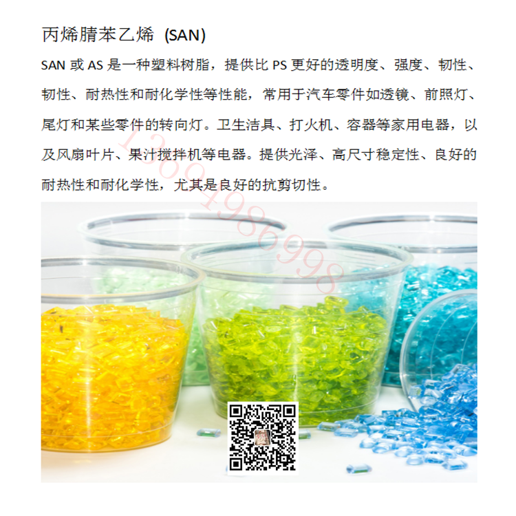 SAN 是具有透明性、光澤性等優(yōu)秀特征的透明塑料。并且耐沖擊性、耐化學(xué)性能卓越,從家電到辦公設(shè)備、化學(xué)品容器等,廣泛用于多種產(chǎn)品。