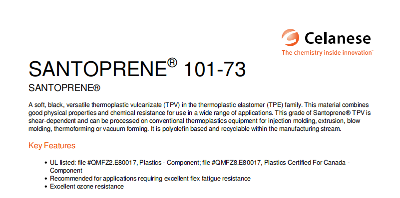 SANTOPRENE™ 101-73 by Celanese is a chemical resistant polyolefin-based thermoplastic vulcanizate (TPV) grade. Provides softness and good physical properties. Exhibits excellent ozone and chemical resistance. It is recyclable within the manufacturing stream and shear-dependent. Suitable for processing by coextrusion, vacuum forming, thermoforming, blow-, injection-, multi injection molding, blow-, profile- and sheet extrusion. Recommended for applications requiring excellent flex fatigue resistance. Used in appliance components, automotive applications like air induction system ducts, boots and bellows for steering and suspension, plugs, bumpers, grommets, clips, seals file #QMFZ8.E80017, Plastics Certified for Canada-Component.