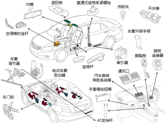 POM(polyoxymethylene)的簡(jiǎn)稱,一般也稱為聚甲醛,甲醛樹脂(acetal resin)。是主要由(-CH2O-)結(jié)構(gòu)單元組成的結(jié)晶性熱塑性樹脂。POM是一種工程塑料,由于其機(jī)械、化學(xué)性能非常均衡,性價(jià)比也很好,所以作為汽車及電氣電子設(shè)備等的各種部件材料被廣泛使用。作為參考,圖1中介紹我公司制造的奪鋼 / DURACON在汽車駕駛室內(nèi)部件中的使用事例。除了汽車駕駛室內(nèi)的部件,也被用于汽車音響及汽車導(dǎo)航等車載設(shè)備內(nèi)部齒輪的滑動(dòng)部件中。