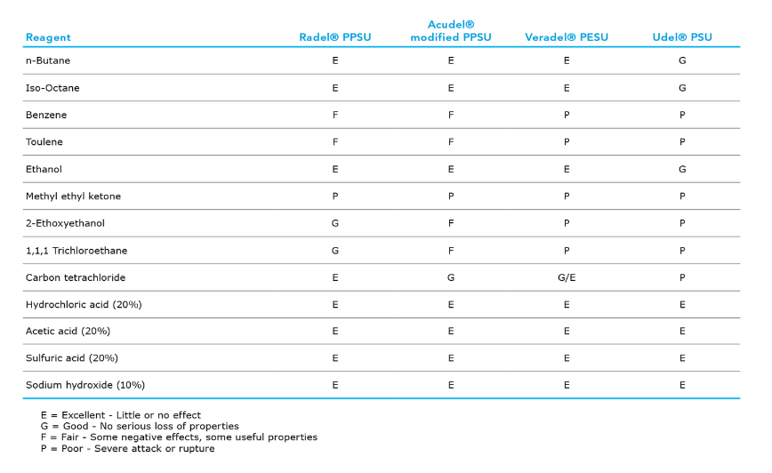 砜類聚合物對許多物質具有良好的耐化學性,包括水體系、腐蝕劑、無機酸、脂肪族烴、洗滌劑和肥皂以及某些醇。