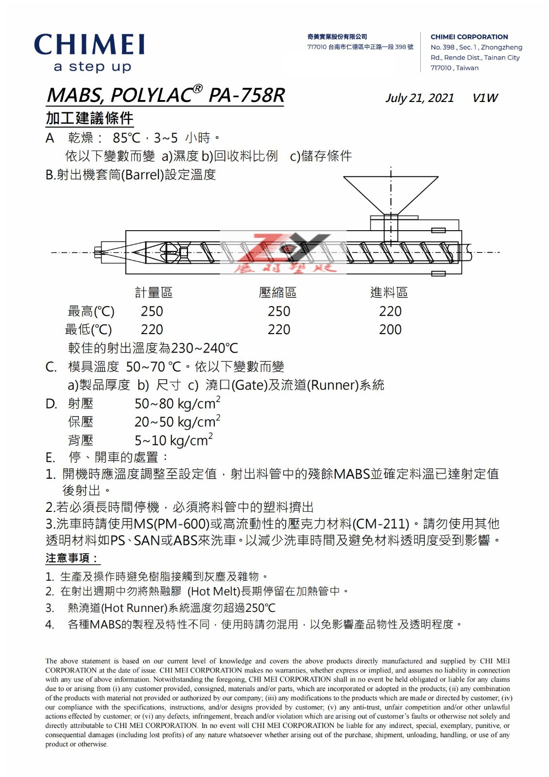奇美的 POLYLAC? PA-758R 是一種耐化學腐蝕的甲基丙烯酸酯丙烯腈丁二烯苯乙烯 (MABS) 級產(chǎn)品。呈透明,藍色少,剛性高。設計用于注塑成型方法。POLYLAC? PA-758R 推薦用于空調(diào)面板、洗衣機罩、吸塵器外殼、3c 產(chǎn)品外殼、家用電器和文具。符合 PFOA、PFOS、RoHS 和 UL 94 HB 阻燃等級。