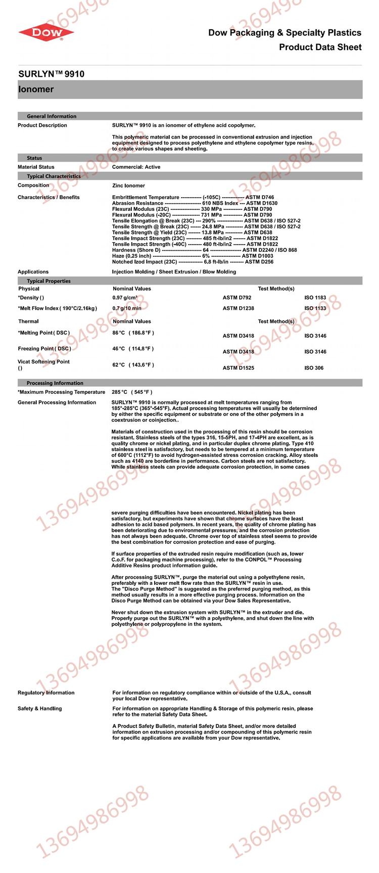 Dow 的 Surlyn? 9910 是一種輕質(zhì)、可靠、具有成本效益的鋅離聚物等級(jí)。具有良好的沖擊強(qiáng)度、出色的低溫韌性和良好的光學(xué)性能。提供低溫密封引發(fā)、出色的熱粘強(qiáng)度、良好的成型性、耐刮擦、耐溶劑和耐穿刺性。它密封污染物,有助于減少泄漏并提高生產(chǎn)線速度??赏ㄟ^吹塑、注塑和片材擠出加工。Surlyn? 9910 的可能應(yīng)用包括工業(yè)、食品包裝、化妝品、醫(yī)療器械、皮膚和拉伸、高爾夫球表面層、滑雪靴和包覆成型瓶。符合 21 CFR 177.1330(a)。