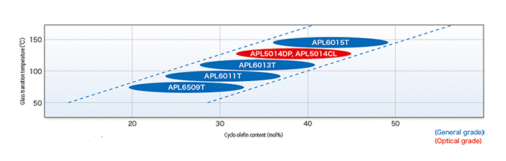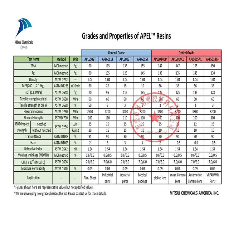 APEL環(huán)烯烴共聚物有七個(gè)等級(jí),具有很強(qiáng)的透明度、水蒸氣阻隔性和耐熱變形性。其中五個(gè)牌號(hào)適用于通用應(yīng)用,較低的 Tg 牌號(hào)適用于薄膜擠出。兩個(gè)牌號(hào)適用于光學(xué)應(yīng)用和注塑成型應(yīng)用。所有牌號(hào)均表現(xiàn)出良好的熱性能、介電性能和電性能、低收縮率和低吸濕性。