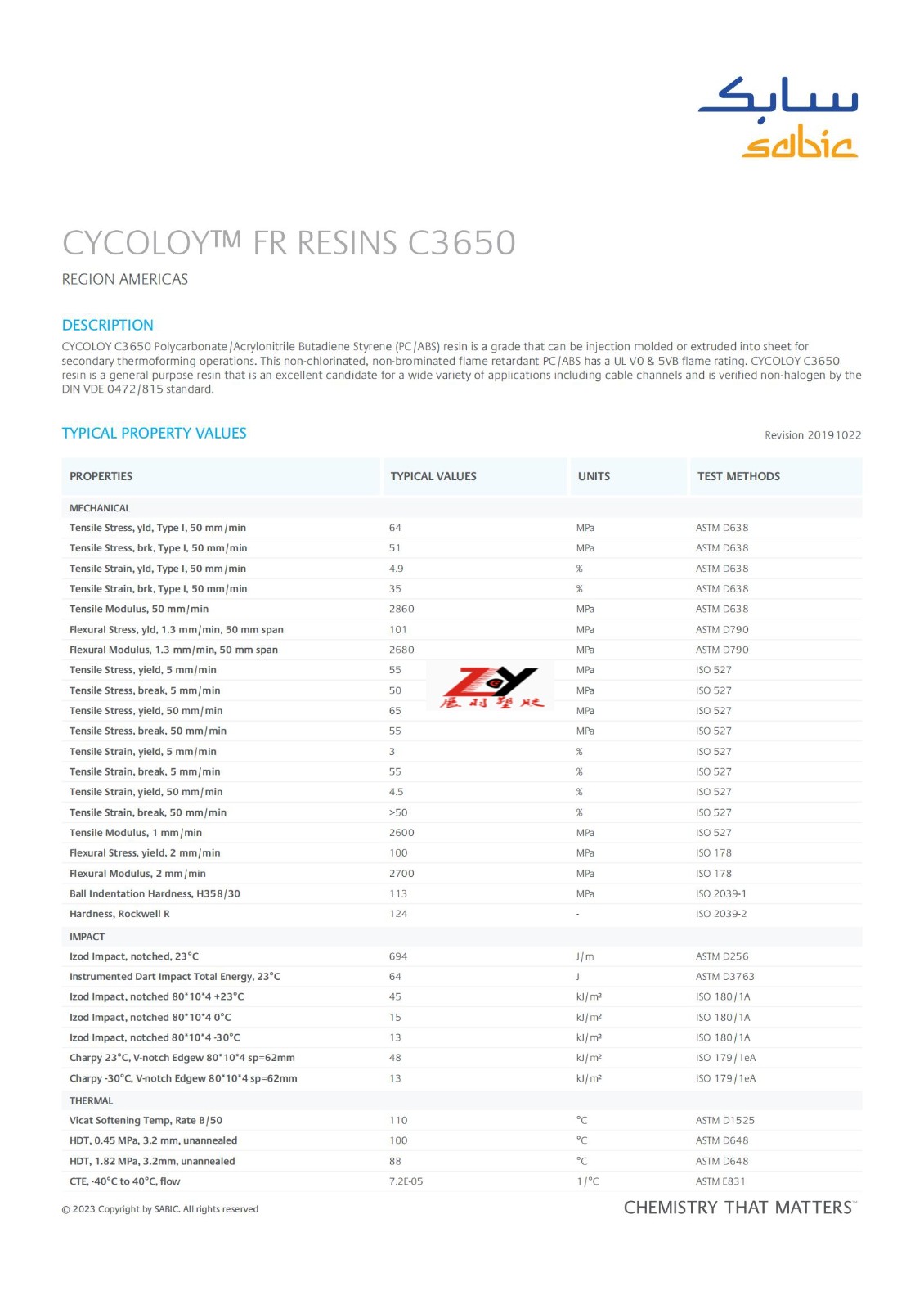 CYCOLOY C3650 物性參數(shù)表 PC/ABS物性數(shù)據(jù),CYCOLOY? FR RESINS C3650,PC+ABS物性表,聚碳酸酯+丙烯腈丁二烯苯乙烯