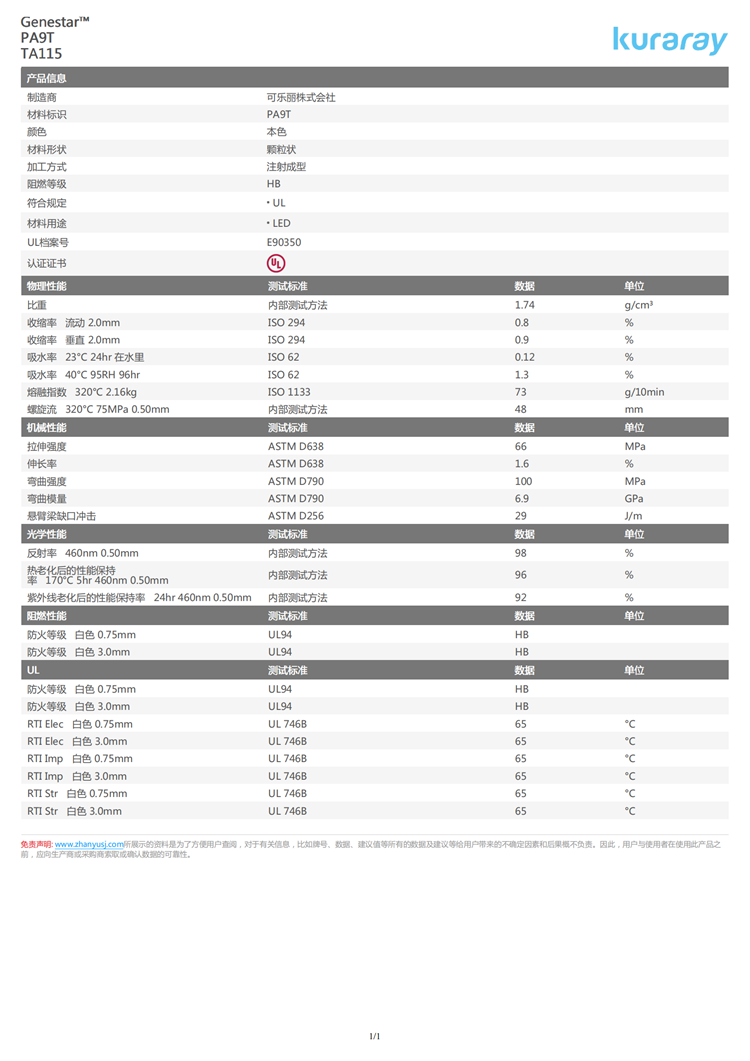 可樂麗 Genestar™ PA9T TA115 >PA9T< 阻燃等級: HB 缺口沖擊: 2.95 kJ/m2 符合規(guī)定: UL 材料用途: LED