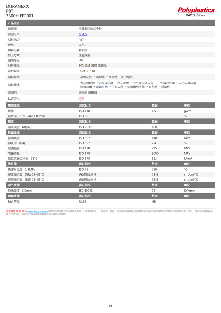 DURANEX® PBT 3300H EF2001 玻纖30% 防燃油 耐油脂 電子電動(dòng)和汽車應(yīng)用